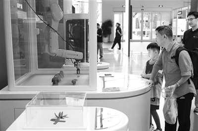 图为观众在“科创筑基·科普惠民”创新成果展观看北京交通大学研发的磁控4D打印及软体机器人。本报记者 洪星摄