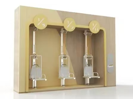 “自己拉自己”实际上是一个原始的起重机装置。由滑轮组、气动缓冲机构和座椅等部分组成。每个座椅上方分别有一套滑轮组,绳子将座椅和滑轮组连接在一起,每套滑轮组上的绳子股数各不相同。当你选择坐在其中一个座椅上,使劲拉前方的绳子,就可以把自己拉起来啦!座椅不同,你还会发现把自己拉起来用的力的大小也不同。这就是运用了滑轮的“魔法”!