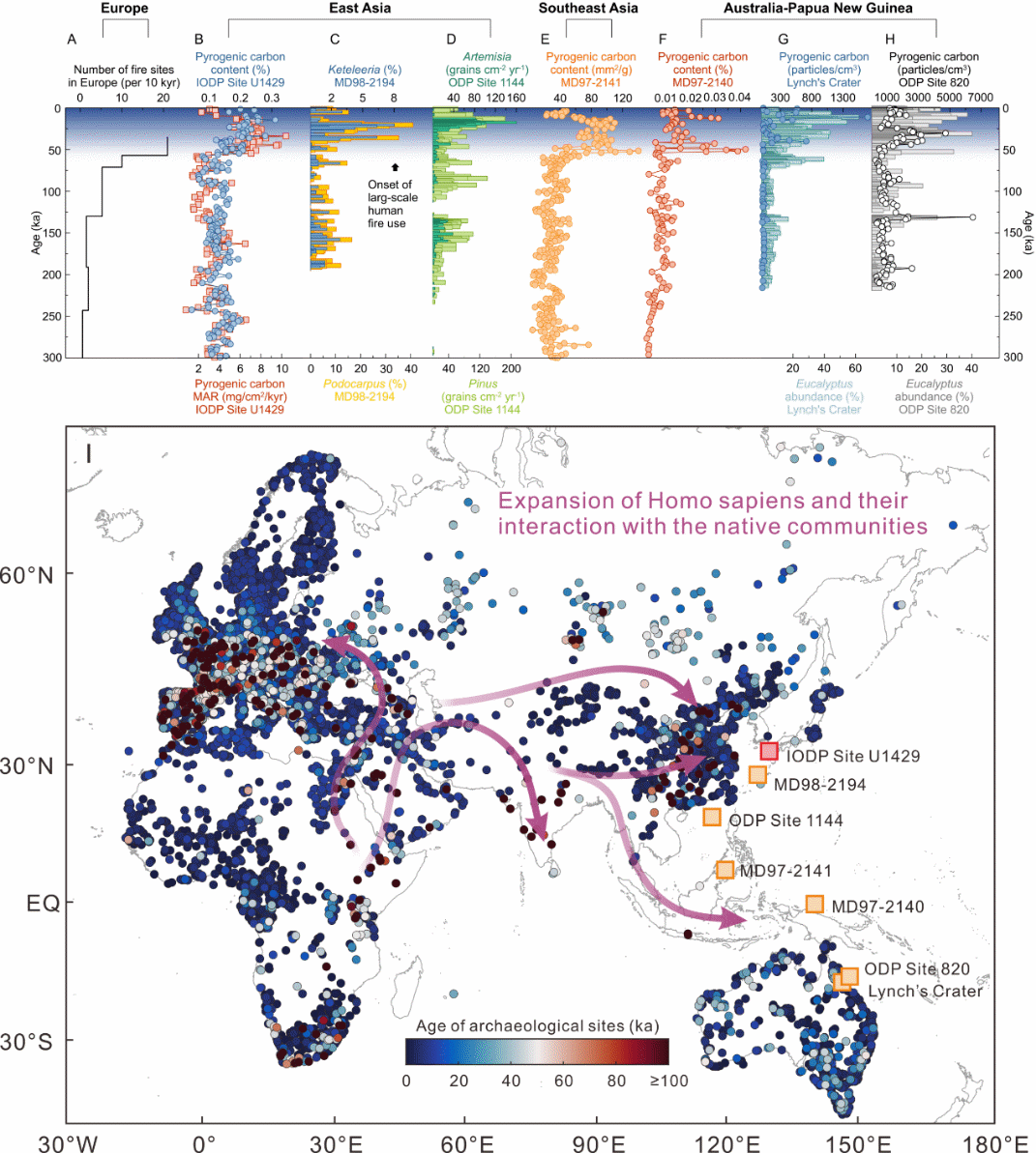 进一步综合对比全球其他区域的古火证据,研究团队发现,5万年前在欧洲、东南亚以及巴布亚新几内亚-澳大利亚等地区,均出现了火强度急剧升高的现象。研究认为,这一时期正值现代人类第二次走出非洲的迁徙历程,冰期海平面下降使得印太暖池区大面积陆架出露为陆地,雨林屏障作用减弱,人类在短时间内迅速扩散至东亚、东南亚乃至澳大利亚。人口的急剧扩张极大地促进了用火频率的上升,同时冰期气候寒冷、食物资源匮乏也增加了人类对用火的需求。