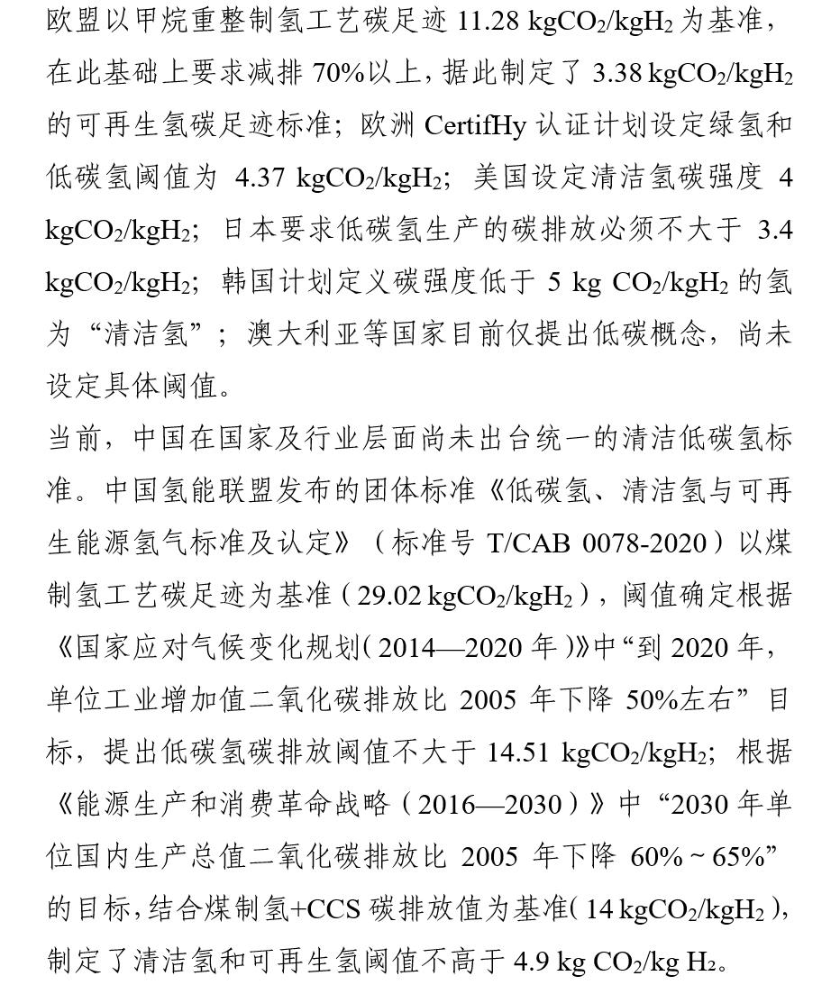 目前国际上尚未正式发布关于“清洁低碳氢”的统一标准,各国基于本国资源、技术和产业发展情况,对氢气的来源、工艺和碳足迹强度进行了划分,提出了不同定义和要求。具体而言: