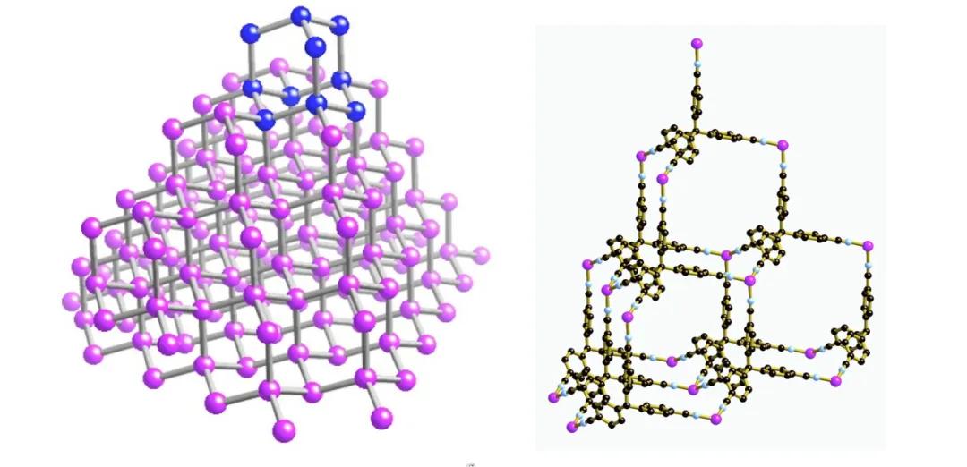 左边是钻石结构,这是最简单的实验结构。右边是铜I-四腈骨架具有相同的结构,但在骨架内部引入了大量空间