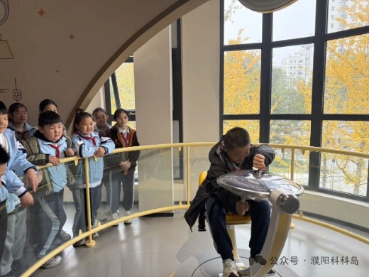 旋转奥秘!角动量守恒的直观演示。物理学中抽象的角动量守恒定律,在科科岛里变成了直观有趣的互动展项。坐在转盘上,双手握持旋转车轮,当改变车轮方向时,学生能亲身感受到自己旋转速度的变化。这个实验展示了角动量守恒定律:当车轮的方向改变时,为了保持总角动量守恒,人体就会朝相反方向转动。花式滑冰运动员通过收拢和伸展手臂来改变旋转速度,利用的正是这一定律。