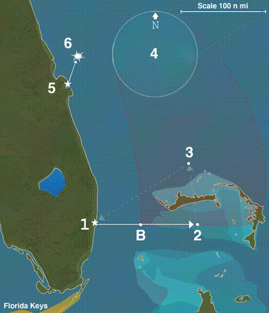 第19飞行中队事故区域。标识1-3:原定演习路线;标识4:中队偏航后无线电探测到的最后位置;标识5-6:马丁PBM-5“水手”救援机起飞与爆炸位置(图源:Wikipedia)