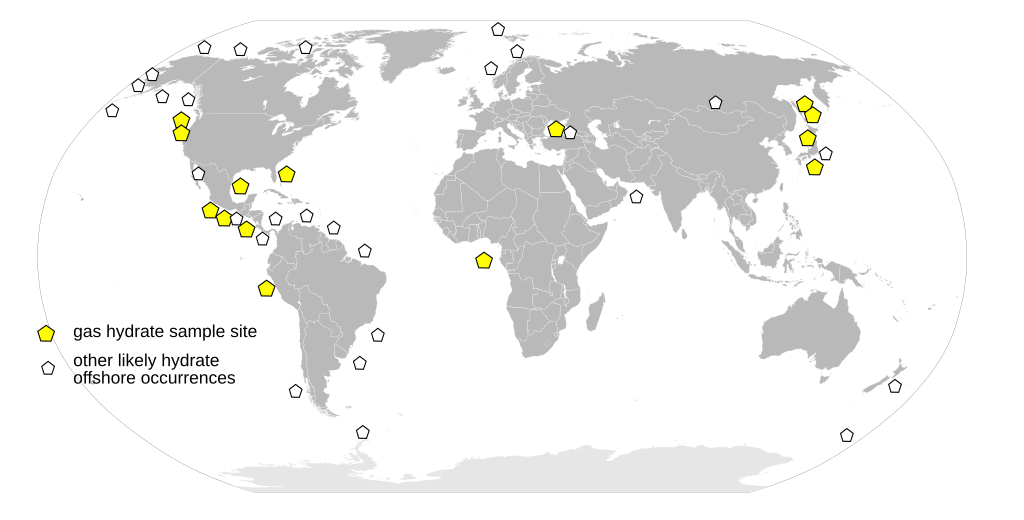 1996 年,科学家已在多处近海发现或推测存在甲烷水合物沉积(图源:USGS)