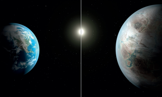 开普勒442是一颗橙色的恒星,质量约是太阳的五分之三,开普勒442b在距离其0.4天文单位的轨道上每112天公转一周。开普勒442b与开普勒438b是同一天宣布被确认发现的,其直径是地球的1.34倍,且位于宜居带内,如果进一步研究能够确认开普勒442b的大气状况,那么它极有可能成为第二个地球的候选者,不过它距离我们有1200光年,实在是太远了。图为开普勒442b(左)与地球的对比图像。