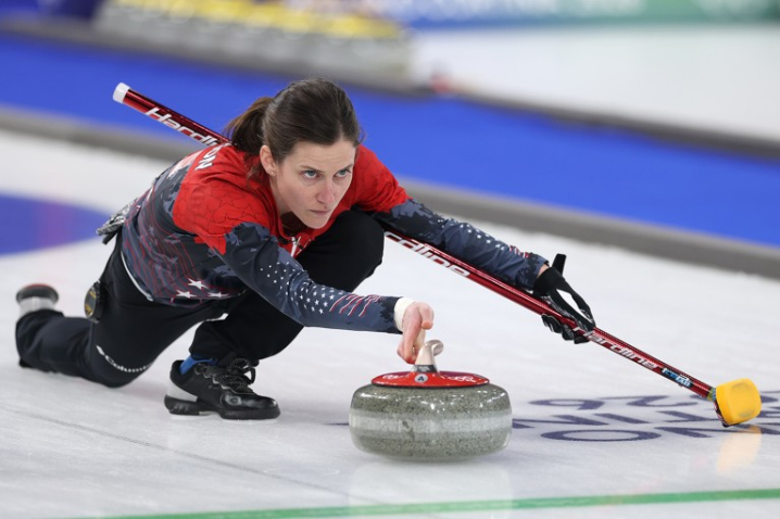 意大利冬季奥运会女子冰壶比赛中,美国女子冰壶队的Tara Peterson投掷冰壶。