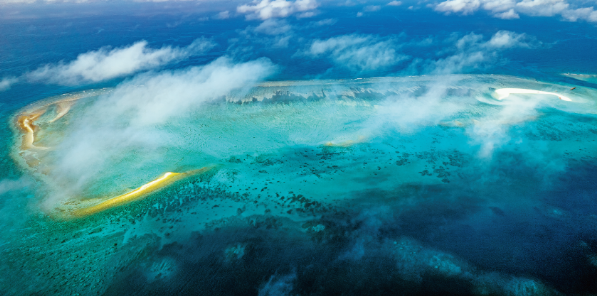珊瑚需要在温暖的区域生存,因此地球上的珊瑚礁基本出现在南北纬30°之间的海域,中国的南海海域也有广泛分布。依据礁体与岸线的关系,珊瑚礁可分为岸礁、堡礁和环礁3 种。岸礁亦称“裙礁”或“边缘礁”,如同裙摆镶嵌在陆地边缘;堡礁又称“堤礁”,位于陆地外缘、离岸一定距离的堤状礁体与陆地合围出一片湖水;环礁则以礁体为湖盆,隔开海水,将湖水环抱其中。也就是说,堡礁和环礁都能够形成礁湖,这些礁湖的水深在20~100 米,多呈环状或马蹄状,通过缺口与海洋相通。