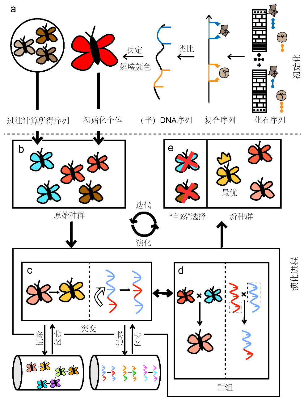 为了从海量数据中还原出真实的演化历程,古生物学家和人工智能专家联手,创新性地开发了受人工智能启发的新一代定量地层学算法——基于演化算法的约束最优化法(Constrained Optimisation-Evolutionary AlgorithmCONOP.EA)。该算法的思路很有意思:把每个可能的全球地层对比方案模拟成一段“DNA”,然后让这些“DNA”像生物一样经历变异、重组和自然选择。每一代“DNA”中,更优的方案被保留,较差的被淘汰。经过无数次的迭代,最终筛选出最合理、最一致的地层对比结果(图2)。